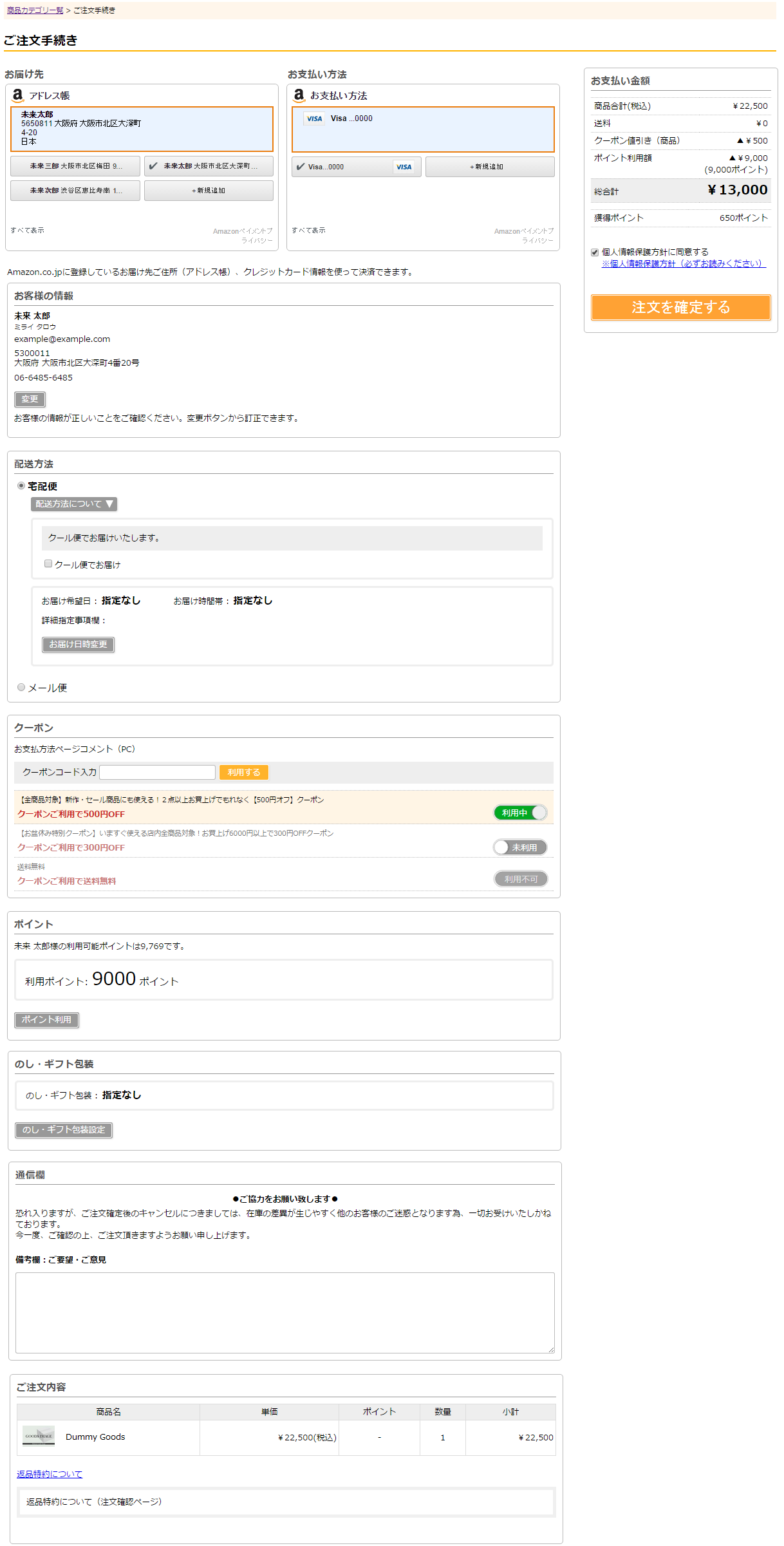 アドレス帳からお届け先を選び、お支払い方法から注文に使用するクレジットカードを選んでください。お客様の情報が正しいか確認してください。 ご希望の配送方法を選んでください。クーポンまたはポイントをご利用される場合は、利用設定をしてください。お支払い金額をご確認の上、注文を確定するをクリックしてください。注文確定ボタンをクリックすると注文完了になります。
