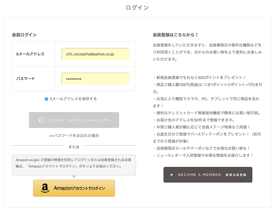 すでに会員として登録されている場合、会員ログイン画面が表示されます。 ご登録いただいているメールアドレスとパスワードを入れてログインをクリックしてください。ログインが成功すると、ご注文手続き画面に移動します。