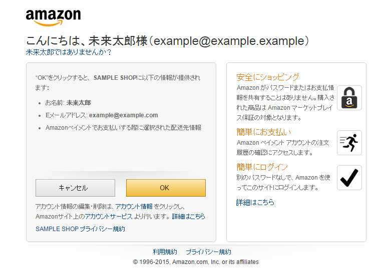 Amazonログインによって、Amazonから情報が提供されることに同意する画面です。OKをクリックすると、ご注文手続き画面に移動します。2回目のAmazonサインインからは表示されません。