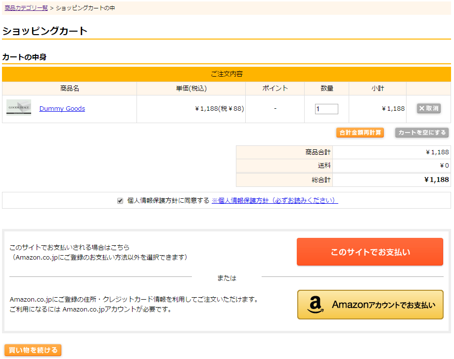 STEP1ショッピングカート画面でAmazonアカウントのお支払いを選択 |