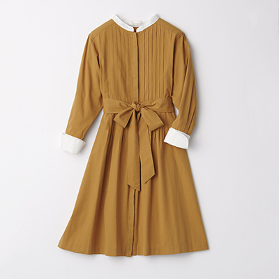 こちらの商品の発送は5/15月以降になります美しいピンタックに大人の雰囲気が漂うワンピースです。シックなゴールドカラーに真っ白なカフスとスタンドカラーがアクセント。ドロップショルダーに仕上げアーム幅もゆったりとしているので、まとうだけでこなれ感のあるスタイルが完成します。少しサイズが小さくなったらシャツコートとしても活躍。素材も縫製もメイドインジャパンにこだわった長く愛用できる一着です。