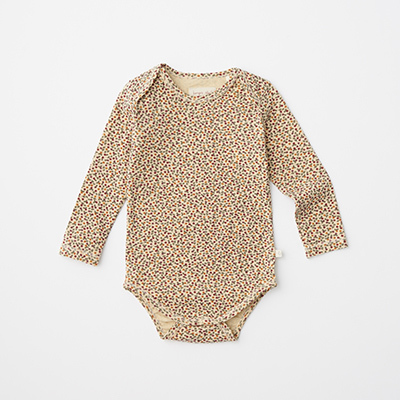 やわらかな肌ざわりのオーガニックコットンを主素材に、ストレッチ性に優れたエラスタンで動きやすさをプラスしたロンパースです。上品な小花柄を中心に、男の子におすすめのダイナソー柄など多彩なプリントをラインナップ。12Mサイズは肩が折りかぶせタイプ、18Mはスナップボタン仕様です。