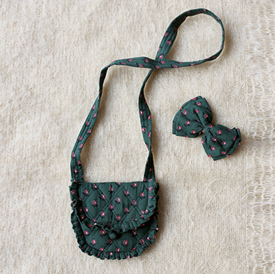 ・グリーン地に赤い花が咲くポシェットと共布のリボン付きヘアクリップのセット。