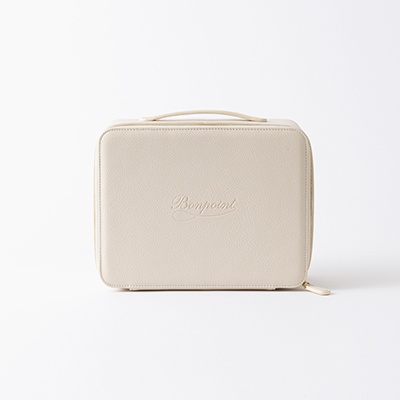 フロントにBONPOINTのロゴを型押しした、ミニサイズのスーツケースです。ラウンドジップを開くとゴールドのドットとBONPOINTチェリーがお目見え。キッズのお出かけアイテム入れや、バニティポーチ、おうちでのおもちゃ入れなど、いろんな使い方が楽しめます。