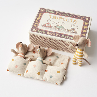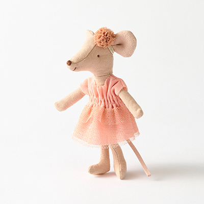 デンマーク発。バレリーナの衣装が素敵な、おねえちゃんネズミのぬいぐるみです。衣装とリンクしたヘアバンドがとってもキュート。手のひらに磁石が入っていて両手がピタッとくっつきます。レトロなフラワー柄のボックスも可愛らしく、ギフトにぴったりです。【対象年齢】3歳〜