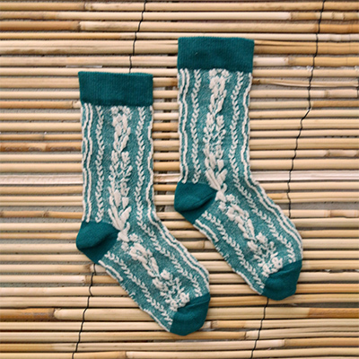 ・ライン上に並んだ花と縄の編み模様が可憐なキッズソックス。・肌ざわり柔らかなコットンミックス。・お色違いもございます。