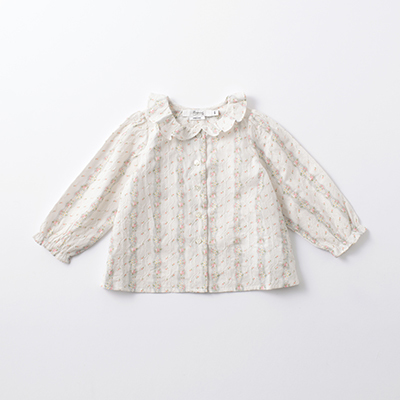 フリル襟とふっくらとした袖が愛らしい、ゆったりAラインのベビーブラウスです。ややクリームがかったホワイトに、フラワープリントが可憐な印象をプラス。ブラウス全体に施した繊細な刺繍が豊かな表情を添えます。