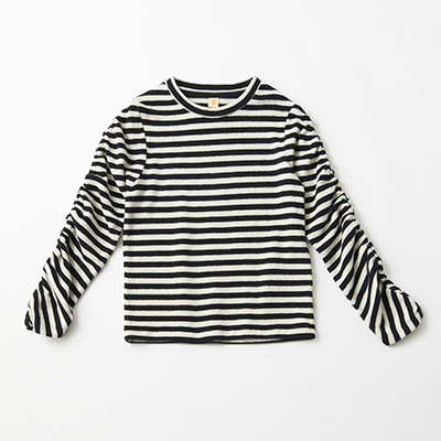 ・袖のゴムギャザーがベーシックなボーダーを格上げするコットンジャージートップス。