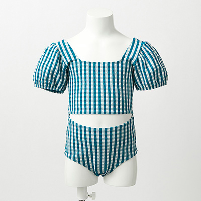 ・ブルーグリーンの濃淡で表現したチェックとバルーンスリーブの組合せがキュートな、セパレートタイプのキッズ水着。