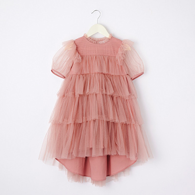 ・薄くて繊細なシフォン生地を重ね、まるで空から降り注ぐ光のようなフォルムを描いたキッズドレス。