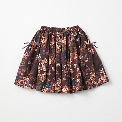 ・ブラウンに水彩タッチのフラワープリントがあしらわれたスカート。・ギャザーをたっぷり寄せたフレアーなシルエット。・両サイドにリボンがあしらわれた大きなポケット付き。・ウエストゴム仕様。アジャスター付き。・同じデザインのライトブルーもございます。