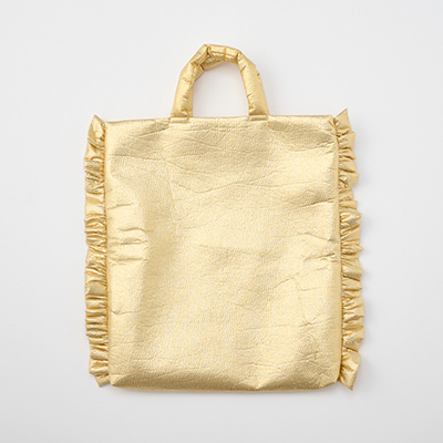 ・A3が収まるビッグサイズのトートバッグ。・インパクト抜群なゴールドカラーに、サイドのフリルがフェミニンなアクセント。・ハンドル部分は中綿入りで手に優しくフィット。・レッスンバッグやサブバッグにおすすめ。・シルバーカラーもございます。