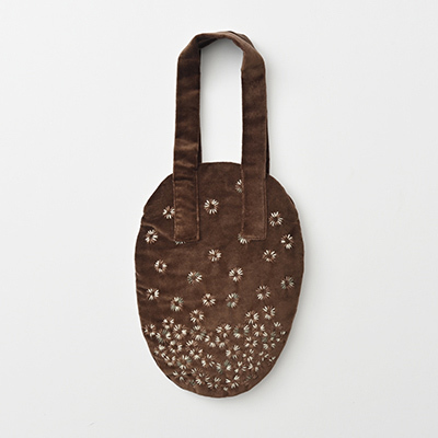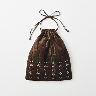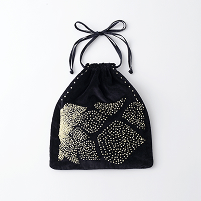発売と共に即完売した、大人の女性の装いにマッチする巾着タイプのバッグです。光沢のあるコットンベロア生地に、蓮の花をモチーフにした立体的な刺繍がエレガント。コードの長さをお好みで調節して、肩に掛けたり手に持ったりとアレンジが楽しめます。バッグ内側に小物の収納に便利なポケットが付いています。