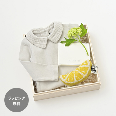 セット内容 ・BONTON ベビー襟付きロンパース(ライトグレー)6Mサイズ ・BONTON ベビーレモンラトル(イエロー)one size ベビーのお出かけ着にぴったりのきちんと感を演出する襟付きロンパースと、レモンをモチーフにしたユニークなラトルのセット。ロンパースは襟がベビーのデリケートな肌にも優しいガーゼ素材、身頃はサラッとしたカットソー素材でリラックスした着心地です。ラトルはベビーの小さなお手々でも握りやすいフォルム。アフターユースできるギフト用木箱に入れてお届けします。 ・メッセージカードの印字、持ち運び用の紙の手提げ袋のサービスもございます。(※ご注文時の通信欄に、メッセージの印字内容、紙袋ご希望、とご記入ください)*ギフトボックスの中にグリーンは入りません。グリーンは外側に添えるのみになります。外側のグリーンがご不要の場合は、通信欄に「グリーン不要」とご記入ください。