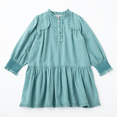 ・襟、肩、前立、背中のヨーク、袖口、裾に柔らかなフリルをあしらった優雅なキッズワンピース。・袖口がスモッキングで伸縮するふっくらボリュームのあるスリーブ。・胸もとにボタン3個。
