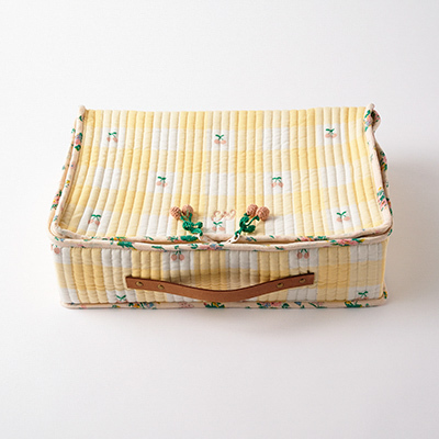 ・柔らかなコットンキルティングを使用したトランク。・表側はパステルイエローのギンガムチェック柄、内側はフラワーブーケ柄のコンビ。・大きく開くダブルのラウンドファスナー。・レザーハンドル。・フロントにブランドのイニシャルの刺繍入り。・バッグ内側に補強のためのポケット付きフレーム。・フレームを倒せばコンパクトに折り畳める仕様。・旅行時に着替えを入れたり、お部屋の収納としても活躍。・柄違いもございます。※ハンドルのレザーは天然皮革特有の色ムラやシワ、素材感などがひとつひとつ異なります。予めご了承ください。