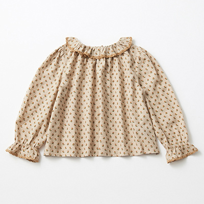 ・花が咲いたようなラッフルカラーが可憐なムードを演出するキッズブラウス。・軽やかな着心地のコットン100%。・襟と袖口にスカラップ刺繍。・楽に脱ぎ着できるプルオーバータイプ。・袖口はゴム入りフリル。