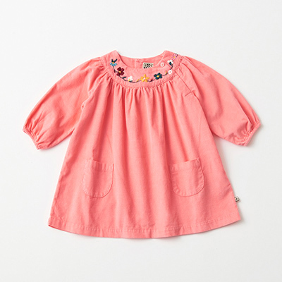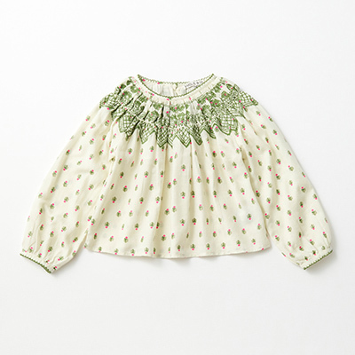 ・一面にチューリップが咲くプリントが愛らしいキッズのブラウス。・ネックラインを美しく彩る印象的な刺繍。・刺繍部分は肌側に裏地が付いた、チクチクしにくい仕様。・背中側にボタン1個。・ネックラインと袖の縁にピコステッチ入り。・袖口はボタン留め。・チェック柄もございます。