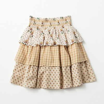 ・花柄、チェック、小花柄と3種のプリント生地を重ねたキッズのティアードスカート。