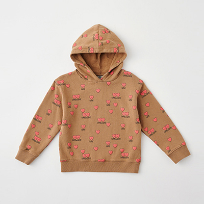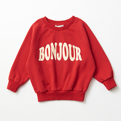 ・ふんわり暖かな裏起毛フリースを使用したオーガニックコットンのジャージースウェット。・胸に「BONJOUR」のビッグプリント、背中側の首もとにはハートの刺繍入り。・肩周りが楽なラグランスリーブ。