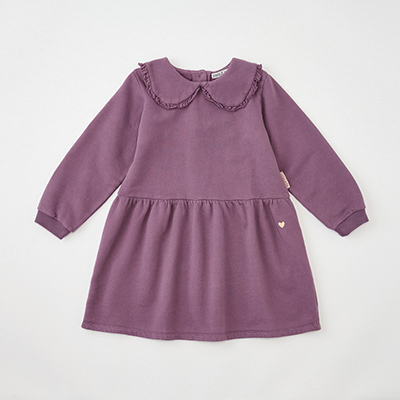 ・秋冬らしいスモーキーパープルのスウェットワンピース。・シンプルなデザインに、フリル付きの襟とゴールドカラーの小さなハート柄の刺繍がアクセント。・ウエストで切り替え、ギャザーを寄せたふっくらとしたシルエット。・起毛性のある裏地で暖かい着心地。・背中側にボタン3つ付きで首通しがスムーズ。・一枚着るのはもちろん、スキニーパンツやレギンスとコーディネートもおすすめ。