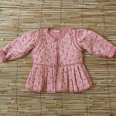 ・ピンク地にローズのモチーフを散りばめたガーリーな雰囲気漂うペプラムジャケット。