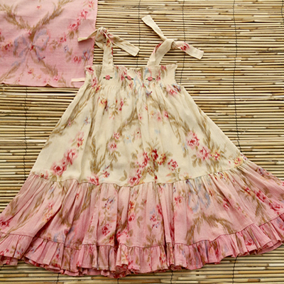 ・淡いピンク地にローズのモチーフが映える可憐な雰囲気のストラップワンピースとスカーフのセット。