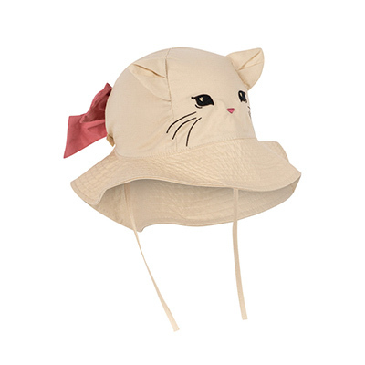 ・猫のお顔が注目を集めるキッズのサンハット。・GOTS認定のオーガニックコットン100%.・背面に大きなリボン付き。・あご紐付き。