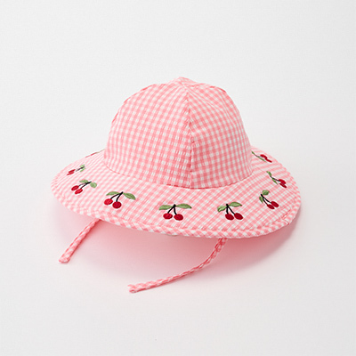 ・ビーチやプールで活躍するスイムハット。・ピンクのギンガムチェックにチェリー柄の刺繍があしらわれたキュートなデザイン。・ツバ部分にパット入り。強い日差しをガード。・涼やかなシアサッカー生地を使用。・あご下で結べる紐付き。・同じデザインの水着とセットで着用するのもおすすめ。