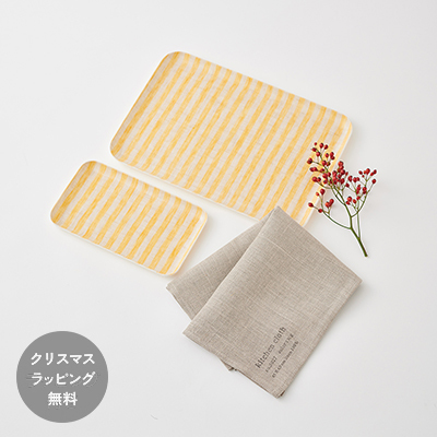 FOG LINEN WORK リネンコーティングトレイ ヘンリー(YEBE イエローストライプ)S、Mとリネン・キッチンクロス(普通地)ナチュラルのセット