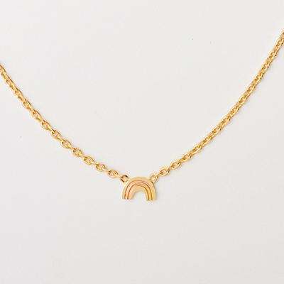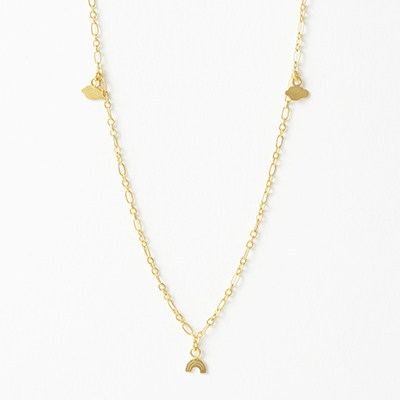 ・空を彩る虹のモチーフとふわふわと浮かぶ雲を交互にあしらったチョーカーネックレス。 ・ネックレス部分は長さ約39cm。(アジャスター付き) ・真鍮に24金のメッキ仕上げ。 ※小さなお子さまやペットのいるご家庭では誤飲などがないよう、安全に配慮してご使用ください。 ※金属アレルギーが置きにくい素材を使用しておりますが、すべての方にアレルギーがおきないことをお約束するものではございません。