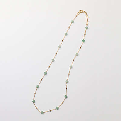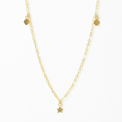 ・ホワイトの星型ストーンがあしらわれたステーションタイプのネックレス。・チェーン長さ約40〜43cm。・金属部分は真鍮に24金のメッキ仕上げ。