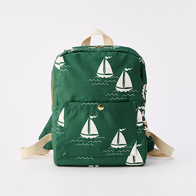 ・100%リサイクルポリエステルで作られた、ヨット柄がかわいいモスグリーンのバックパック。