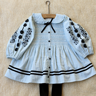 ・水色のストライプ生地にブラックの刺繍やラインが映えるキッズドレス。・首もとに取り外しできるベロアのリボン付き。・上半身は伸縮するゴムシャーリングで楽な着心地。・フロントはボタンで全開する仕様。・ボリュームのあるスリーブに花の刺繍を施し、袖口にはゴムが入っています。・ミニ丈レングス。
