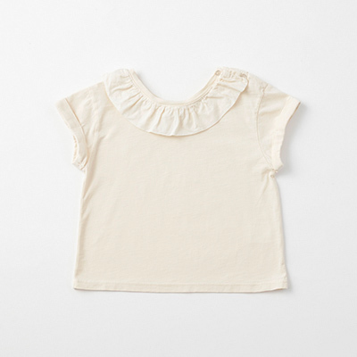 ・花びらのようなフリルカラーが印象的なキッズのTシャツ。 ・ソフトな手ざわりのオーガニックコットン100%。 ・左肩にボタン付き。 ・ロールアップした袖は縫い止めてあり、ずり落ちや型くずれしにくい仕様です。 ・お色はオフホワイトとピンクがございます。