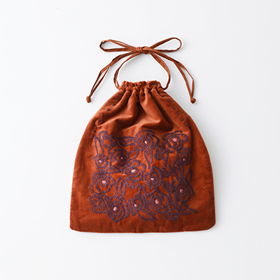 発売と共に即完売した、大人の女性の装いにマッチする巾着タイプのバッグです。光沢のあるコットンベロア生地に、椿の花をモチーフにした立体的な刺繍がエレガント。コードの長さをお好みで調節して、肩に掛けたり手に持ったりとアレンジが楽しめます。バッグ内側に小物の収納に便利なポケットが付いています。