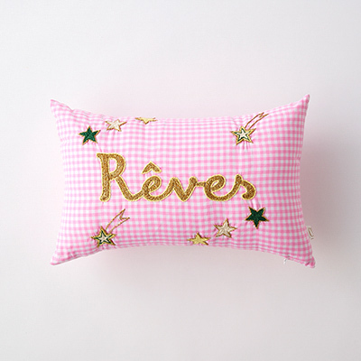 ・フランスのフェアトレードブランド「CSAO(サオ)」のメッセージ入りミニクッション。・アフリカの女性刺繍師が手刺繍したフランス語の「Rêves(夢)」のメッセージ入り。・中芯入り。・カバーはファスナー付きで取り外しが可能です。