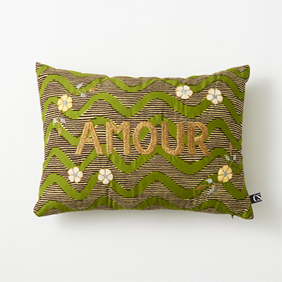 ・フランスのフェアトレードブランド「CSAO(サオ)」のメッセージ入りミニクッション。・アフリカの女性刺繍師が手刺繍したフランス語の「AMOUR(愛)」と花のモチーフ入り。・中芯入り。・カバーはファスナー付きで取り外しが可能です。