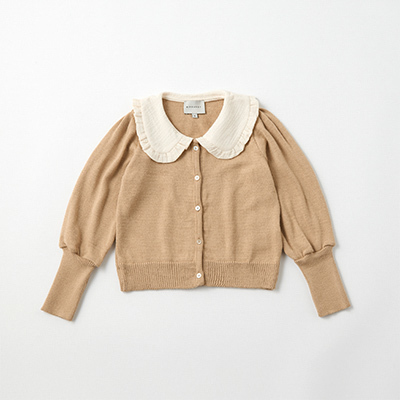 ・ブラウス感覚で着こなせるカーディガン。・ガーゼ生地の大きな襟がアクセントになった、カジュアルにもキレイめにも着回せるデザイン。・肩にギャザーを寄せたボリュームのあるスリーブがこなれた雰囲気。袖口は長めのリブでフィット感があり動きやすい。・フロントはボタン留め。