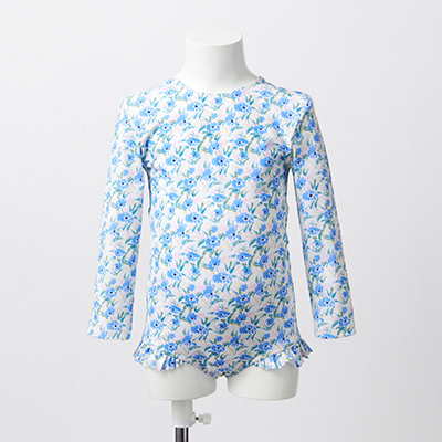 ・気になる日差しからデリケートな素肌を守る長袖タイプのキッズワンピース水着。・素材はなめらかな肌ざわりのリサイクルポリアミド&ライクラ。・背中側が着物のような打合せになったデザインで、お着替えしやすい仕様。腿まわりにあしらったフリルもチャーミングです。・世界的基準最高値のUPF50+で、紫外線から肌をしっかりガード。キッズの肌にも地球にも優しい水着です。