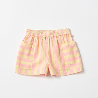 ・淡いレモン色とスイートなピンクのストライプがキュートなキッズのショートパンツ。