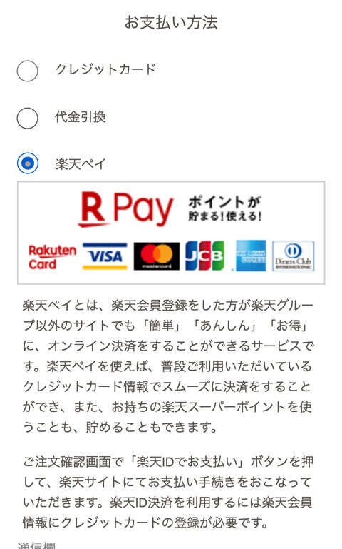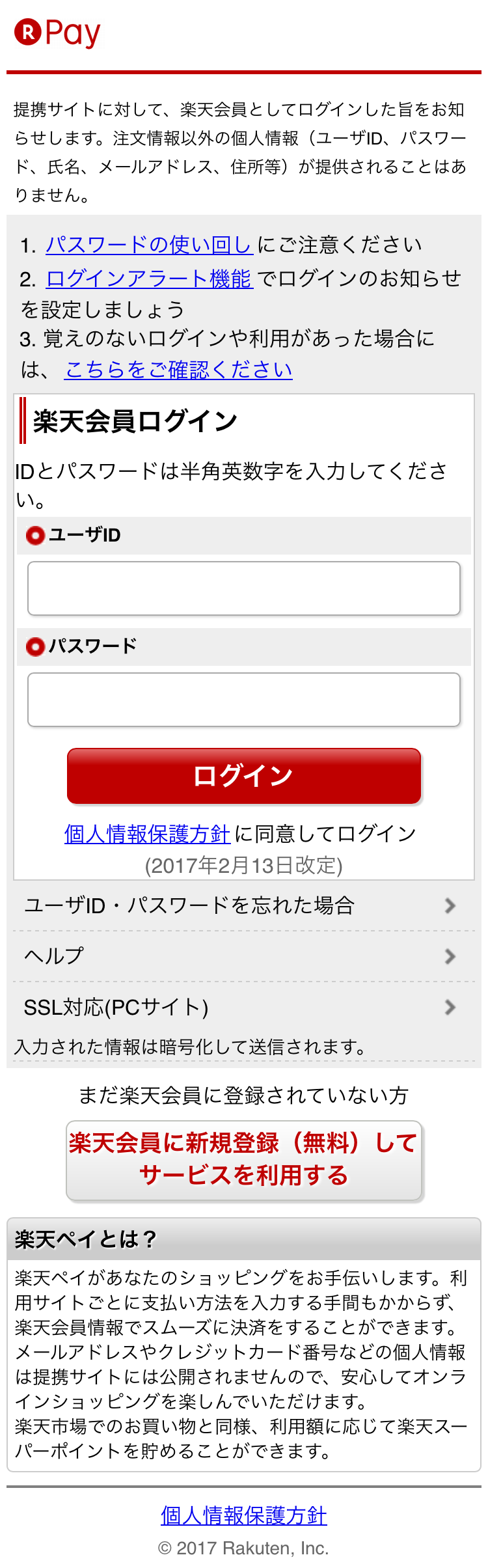 ユーザID(楽天会員ID)とパスワードを入れてログインします。楽天会員に新規登録することもできます。ログインするとお支払方法選択画面へ遷移します。