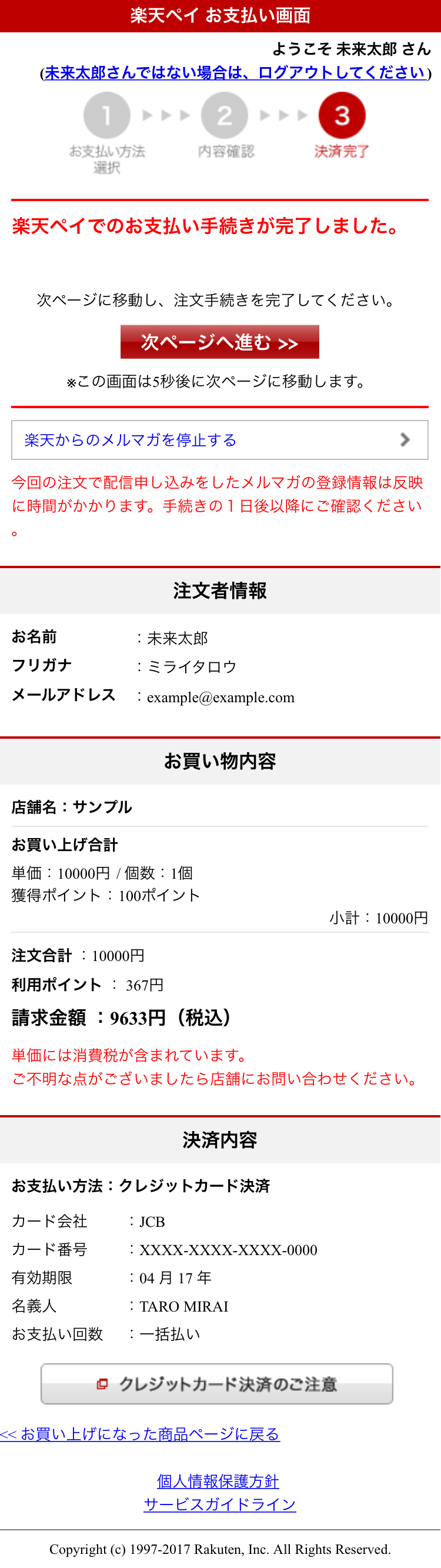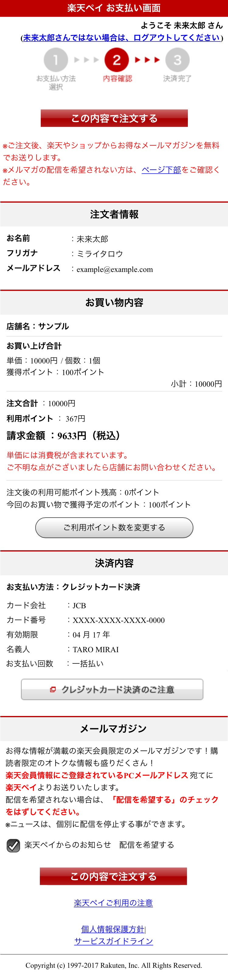 楽天スーパーポイントの利用ポイント数や決済に使用するクレジットカードを確認して、「この内容で注文する」ボタンを押下すると、決済完了画面に遷移します。
