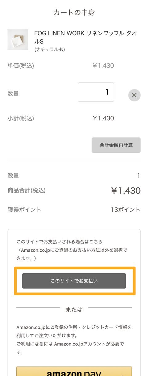 「このサイトでお支払い」ボタンをクリックすると、「ご注文手続き画面」に移動します。