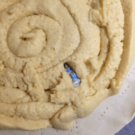 ガレットは、パイ生地にアーモンドクリームを入れて焼き上げたもので、中には小さな陶器がひとつ隠されています。昔は陶器でなく、乾燥した空豆を入れていたため、今でもフェーヴ=空豆と呼ばれています。
