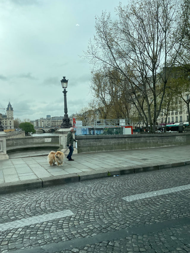 早朝左岸でのミーティングに向かう途中。Pont Royalをお散歩中のもふもふの暖かそうな子。