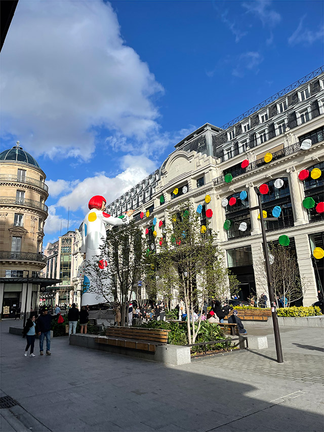 ルイヴィトンの壁をキャンバスにする大きな草間彌生さん。