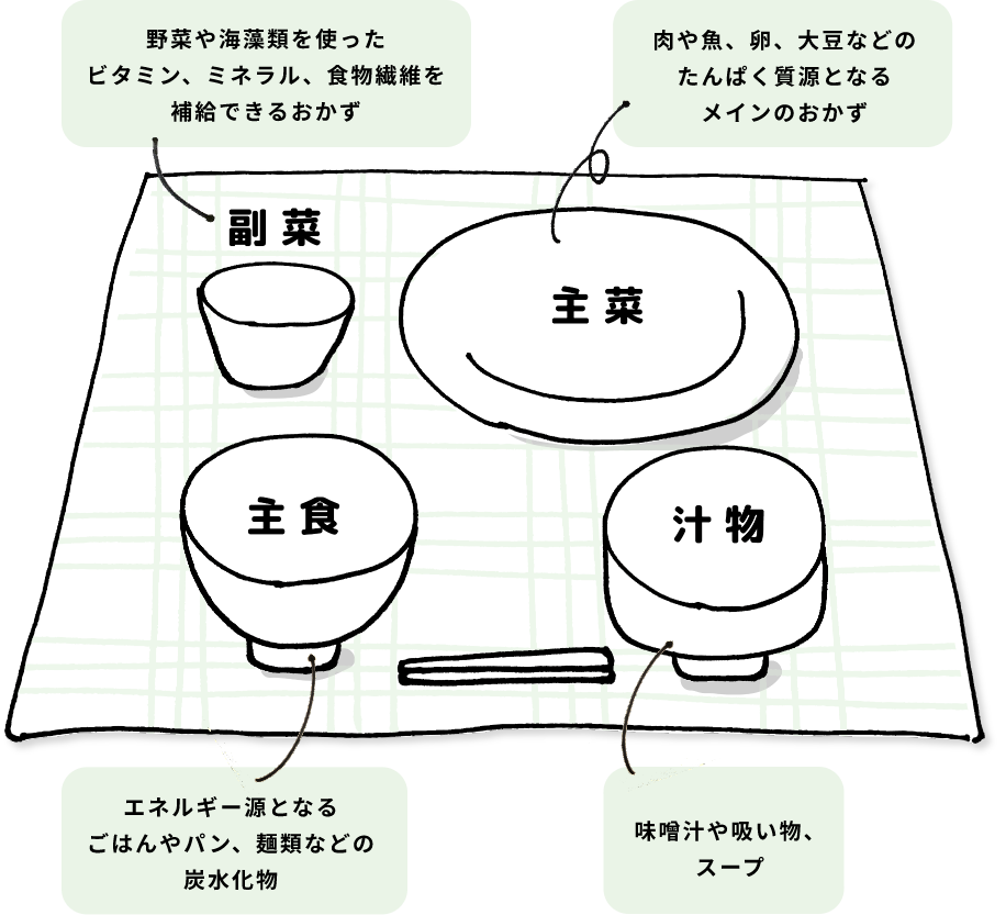 日本で料理は、「主食」「主菜」「副菜」「汁物」に分類され、子どもの食事に限らず献立は「一汁二菜」(主食+汁物+主菜・副菜のおかず2品)が基本と言われています。
