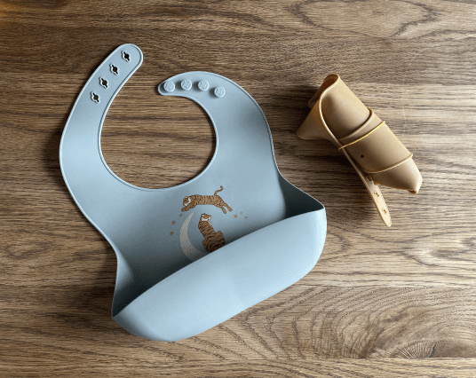 コンパクトにたためて、汚れてもさっと拭き取れるシリコン素材がおすすめ。使い捨ての紙エプロンを活用しても。