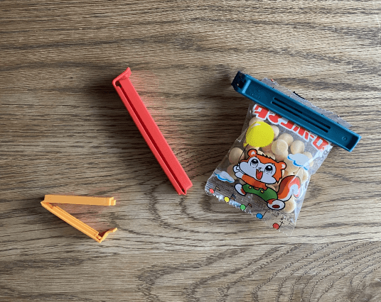 使いかけのふりかけや食べかけのお菓子の袋の口をとめておくのに重宝。大きめの紙ナプキンを首にふわっと巻いてクリップで留めれば即席のエプロンにも。